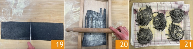 Coupez les feuilles en petits rectangles 19 et placez-les sur la guitare, puis coupez-les en passant dessus le rouleau à pâtisserie 20. Déposez les spaghetti à la guitare sur un torchon propre et fariné avec de la semoule 21.