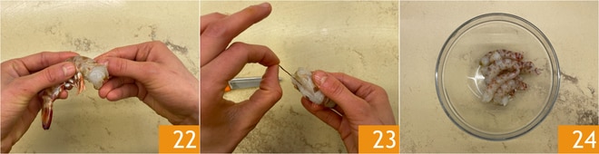 En attendant, nettoyez les crevettes : retirez la tête, la carapace 22 et l'intestin 23, puis mettez la chair dans un bol 24.