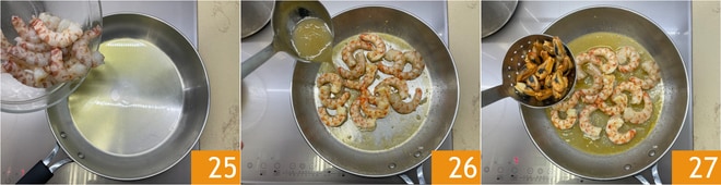 Dans une poêle, versez un filet d'huile, ajoutez les crevettes 25 et faites-les sauter pendant quelques minutes, puis déglacez avec le liquide de cuisson des moules 26. Ajoutez également les moules restantes 27 et cuisez pendant quelques minutes, juste le temps de mélanger les ingrédients.