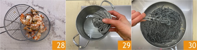 Transférez les moules et les crevettes dans un bol 28 et laissez le liquide de cuisson dans la poêle, il servira plus tard. Cuisez les spaghetti dans une grande quantité d'eau bouillante salée 29, égouttez-les et transférez-les dans la poêle où vous avez cuisiné les moules et les crevettes 30.