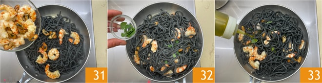 Ajoutez les moules et les crevettes 31, quelques feuilles de marjolaine fraîche 32 et mélangez avec un filet d'huile 33.