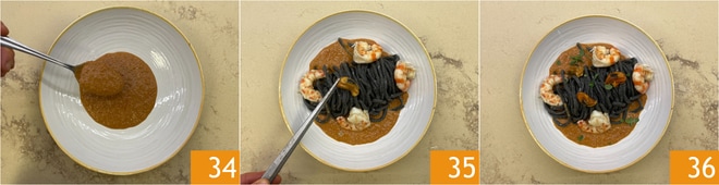 Mettez au fond de l'assiette la crème de moules 34, disposez les spaghetti en nid étalé et complétez avec les crevettes, les moules 35 et quelques feuilles de marjolaine. Les spaghetti à la guitare à l'encre de seiche, moules et crevettes sont prêts à être servis 36 !
