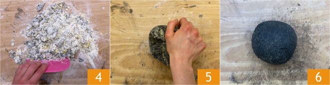 Amalgamez le mélange d'abord avec une raclette 4 puis continuez à travailler avec les mains 5 jusqu'à obtenir une pâte lisse et homogène 6. Enveloppez-la dans du film alimentaire et laissez reposer 30 minutes au réfrigérateur.