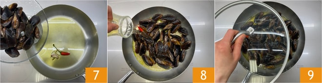 Dans une poêle, versez un filet d'huile, ajoutez le piment, l'ail et les moules 7. Déglacez avec du vin blanc 8 et couvrez avec un couvercle 9, puis cuisez jusqu'à ce qu'elles soient ouvertes.