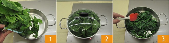 Pour préparer les spaghetti à la guitare verts avec cacio e pepe, commencez par la pâte : dans une poêle, versez les épinards lavés 1, couvrez avec un couvercle 2 et laissez-les flétrir pendant environ 5 minutes, ou le temps nécessaire pour les ramollir 3.