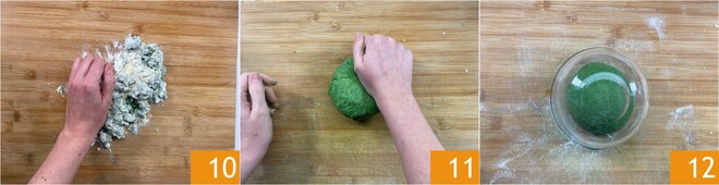 Transférez la pâte sur une planche à pâtisserie 10 et travaillez-la énergiquement pendant environ 10 minutes 11 jusqu'à obtenir une pâte homogène et lisse. Formez un pâton, couvrez-le avec le bol et laissez reposer pendant 30 minutes 12.