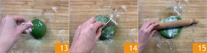 Reprenez le pâton et placez-le sur la planche farinée 13, prélevez-en 1/3 en vous aidant d'un coupe-pâte ou d'un couteau 14. Laissez couvert le reste de la pâte pour éviter qu'elle ne sèche. Étalez le pâton avec un rouleau à pâtisserie 15.