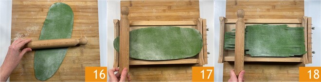 Vous devez obtenir une feuille rectangulaire de 2 mm d'épaisseur 16. Essayez de réaliser un rectangle correspondant aux dimensions de votre guitare. Maintenant, soulevez la pâte en l'enroulant sur le rouleau à pâtisserie et déroulez-la sur la guitare 17. Passez le rouleau sur la pâte en exerçant une pression ferme pour couper la feuille avec les cordes et ainsi obtenir les spaghetti typiques 18. Continuez de cette manière avec le reste de la pâte.