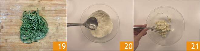 Formez un nid avec les spaghetti à la guitare en les farinant légèrement, puis réservez-les à température ambiante 19. Entre-temps, portez à ébullition l'eau pour la cuisson des spaghetti. Maintenant, préparez la sauce cacio e pepe : dans un bol, versez le Pecorino romano très finement râpé, ajoutez une louche d'eau de cuisson des pâtes 20 et mélangez énergiquement avec un fouet 21 ou une spatule. Vous devez obtenir une consistance pâteuse et sèche, mais lisse et sans grumeaux. Faites cuire les spaghetti dans l'eau bouillante pendant 2-3 minutes.