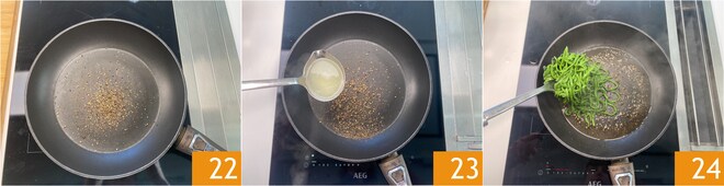 Maintenant, moulez le poivre noir dans une poêle et faites-le griller quelques instants pour intensifier ses arômes et parfums 22. Versez une louche d'eau de cuisson des pâtes 23 et égouttez-y les spaghetti 24.