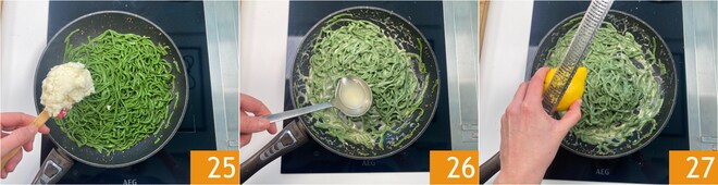 Laissez les pâtes encore cuire comme un risotto pendant 1 minute, puis éteignez le feu et ajoutez la pâte de Pecorino 25. Ajustez la consistance avec une louche d'eau de cuisson et mélangez 26. Complétez avec le zeste de citron râpé 27.
