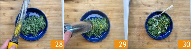 Servez les spaghetti à la guitare verts avec cacio e pepe en garnissant les assiettes à votre goût avec plus de zeste de citron 28 et de poivre noir moulu 29. Savourez-les bien chauds et crémeux 30 !