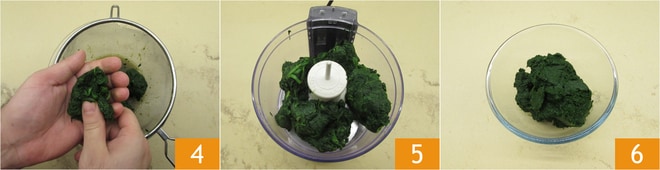 Égouttez-les bien en les pressant dans une passoire 4, puis passez-les au mixeur 5 pour les hacher 6. Réservez-les, il vous faudra 200 g d'épinards hachés.