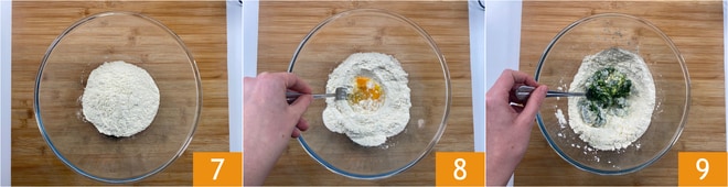 Dans un bol, versez la farine 7 et les œufs 8, puis mélangez avec une fourchette pour rassembler les ingrédients 9.