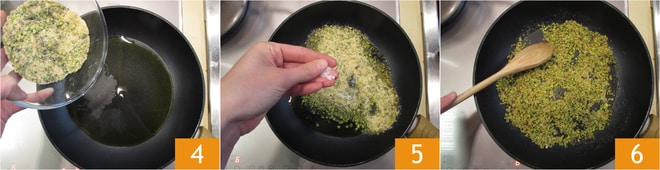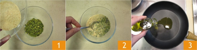 Ajoutez la chapelure et les pistaches 4, salez légèrement 5 et faites cuire pendant quelques minutes, en remuant souvent 6 pour obtenir une cuisson uniforme. Lorsqu'ils sont bien croustillants, grillés et parfumés, retirez le tout du feu et laissez refroidir.