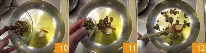 Ajoutez également les olives 10 et les câpres 11. Lorsque le tout commence à frémir, faites cuire pendant environ une minute, puis retirez l'ail et le piment 12.