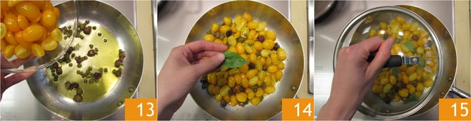 Ajoutez les tomates cerises jaunes 13 et faites sauter à feu vif pendant 5 minutes. Ajoutez une pincée de sucre pour équilibrer l'acidité de la tomate si nécessaire, puis ajoutez quelques feuilles de basilic déchirées à la main 14. Faites cuire pendant environ quinze minutes, à feu doux, en couvrant avec un couvercle 15.