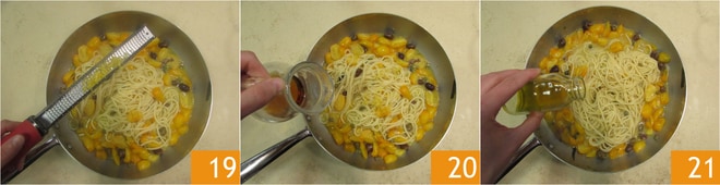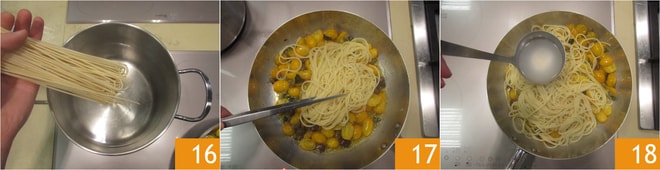 Portez ensuite à ébullition une casserole d'eau légèrement salée (rappelez-vous que la colatura, ainsi que les câpres sont déjà très salés) : faites cuire les pâtes et cuisez-les 4 minutes de moins que le temps indiqué sur le paquet 16. Égouttez les pâtes et terminez la cuisson directement dans la poêle 17, en vous aidant de l'eau de cuisson des pâtes si nécessaire 18.