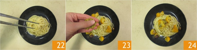 Servez immédiatement 22 en surmontant le tout avec le crumble de pistaches 23. Les spaghetti avec colatura d'anchois et tomates cerises sont prêts à être dégustés 24.