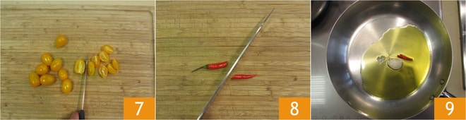 Lavez les tomates cerises, puis coupez-les en deux dans le sens de la longueur 7; mettez de côté. Pour la sauce : coupez le piment en deux 8, chauffez dans une grande poêle l'huile avec une gousse d'ail écrasée et une moitié de piment 9.