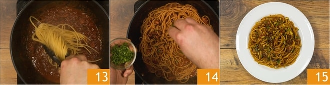 Égouttez les pâtes très al dente et terminez la cuisson dans la poêle avec le condiment 13. Enfin, aromatisez avec le persil haché 14 et mélangez bien le tout. Servez les spaghetti à la sauce de poulpe en ajoutant la chapelure croquante directement dans l'assiette 15 !