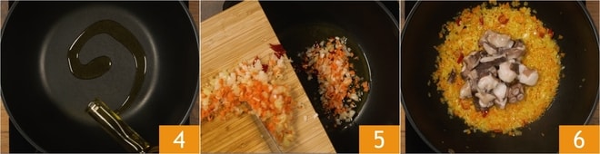 Faites chauffer un filet d'huile dans une grande poêle 4, ajoutez le hachis 5 et faites revenir pendant 4-5 minutes à feu moyen-doux, puis ajoutez le poulpe 6 et faites-le dorer.