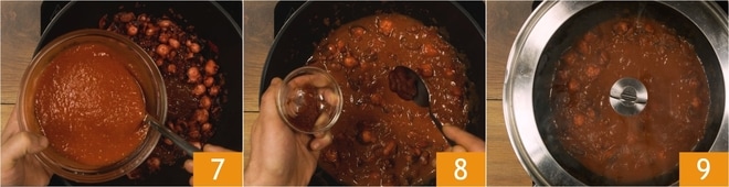 Lorsque l'eau libérée par le poulpe s'est évaporée, versez la purée de tomates 7 et le concentré 8, mélangez bien et couvrez avec le couvercle 9. Cuisez pendant une bonne heure à feu doux, en ajoutant si nécessaire un peu d'eau chaude.
