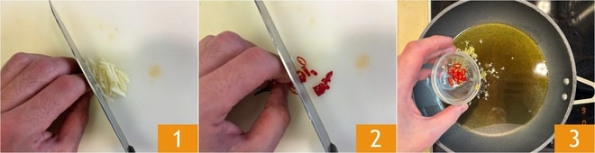 Pour préparer les spaghetti à l'ail, à l'huile et au piment façon risotto, commencez par porter à ébullition une casserole d'eau salée pour cuire les pâtes. En attendant, coupez l'ail 1 et le piment en morceaux 2, puis hachez finement le persil. Versez l'huile, l'ail et le piment dans une grande poêle 3.