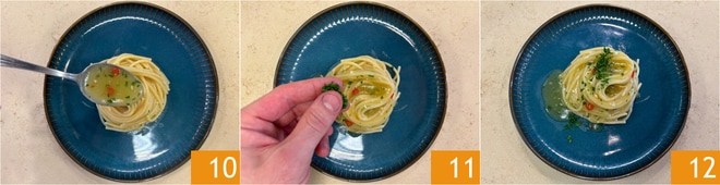 Disposez les spaghetti avec leur sauce dans les assiettes 10 et garnissez avec davantage de persil selon votre goût 11. Servez immédiatement vos spaghetti à l'ail, à l'huile et au piment façon risotto 12 !
