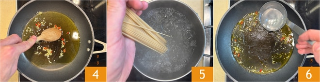 Faites revenir à feu doux pendant quelques minutes, en prenant soin de ne pas brûler l'ail 4. Lorsque l'eau bout, faites cuire les spaghetti pendant la moitié du temps de cuisson indiqué sur le paquet 5. Pendant ce temps, ajoutez au sauté une louche de l'eau de cuisson des pâtes 6.