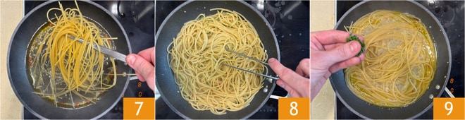 Égouttez les spaghetti directement dans la poêle 7 et terminez leur cuisson en ajoutant de l'eau de cuisson si nécessaire, en remuant souvent comme un risotto 8. Enfin, aromatisez avec le persil haché 9.