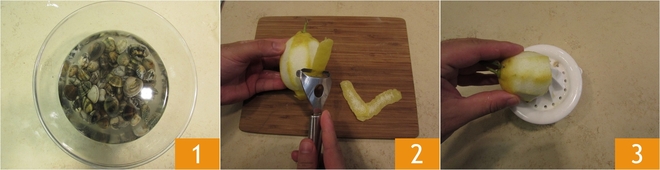 Pour préparer les spaghettis au pesto de citron et palourdes, commencez par ces dernières : faites-les dégorger dans beaucoup d'eau salée pendant 1-2 heures 9, en changeant l'eau quelques fois, pour éliminer les éventuels résidus de sable 1. Pendant ce temps, occupez-vous du pesto de citron : prélevez le zeste du citron avec un économe en évitant de prendre la partie blanche 2, puis pressez-en le jus 3.