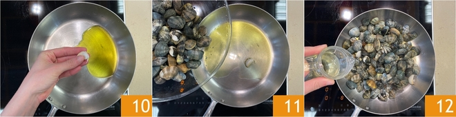 Après avoir fait dégorger les palourdes, rincez-les soigneusement et occupez-vous de la cuisson : dans une poêle, chauffez une cuillère d'huile d'olive avec une gousse d'ail 10 et du piment frais. Ajoutez les palourdes 11 et, lorsque l'huile commence à grésiller, déglacez avec le vin blanc 12. Laissez l'alcool s'évaporer.