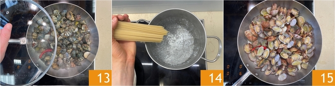 Couvrez avec un couvercle 13 et laissez ouvrir les palourdes à feu vif, cela prendra environ 5 minutes. Pendant ce temps, faites cuire les spaghettis al dente dans beaucoup d'eau salée 14. Lorsque les palourdes sont ouvertes 15, éteignez le feu.