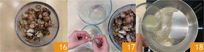 Égouttez-les dans une passoire et récupérez leur eau de cuisson 16. Décortiquez les palourdes 17 en en conservant quelques-unes entières pour le dressage. Versez l'eau de cuisson des palourdes dans la même poêle 18.