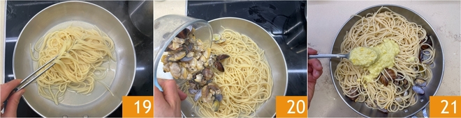 Égouttez ici les spaghettis al dente et terminez la cuisson 19. À la fin, ajoutez les palourdes 20 et le pesto de citron 21.