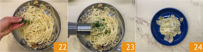 Parfumez avec du persil haché 22 et du poivre moulu 23. Servez bien chauds vos spaghettis au pesto de citron et palourdes 24.
