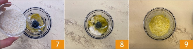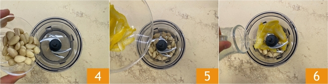 Dans un mixeur, mélangez les amandes émondées 4, le zeste de citron 5 et le jus 6.