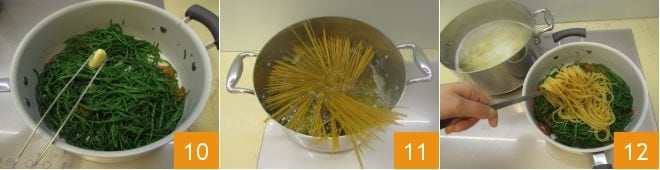 Enfin, retirez l'ail 10. Ramenez l'eau dans laquelle vous avez blanchi les asperges de mer à ébullition pour cuire les spaghetti 11. Lorsqu'il reste 3-4 minutes avant la fin de la cuisson, égouttez-les (en réservant l'eau de cuisson) pour les faire sauter dans la poêle avec la garniture 12