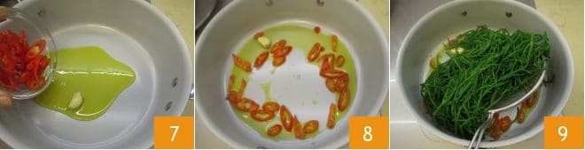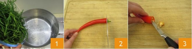 Pour préparer les spaghetti aux asperges de mer, commencez par mettre sur le feu une casserole d'eau, où vous cuirez à la fois les asperges de mer et les pâtes. Faites attention à ne pas la saler cependant, car ce type de plante est très salé. Dès que l'eau est en ébullition, blanchissez les asperges de mer pendant 2-3 minutes (si vous les avez achetées emballées, il ne sera pas nécessaire de les rincer. Suivez en tout cas les instructions sur l'emballage) 1. Pendant ce temps, vous pouvez vous occuper de la garniture. Enlevez le pédoncule du piment 2 et avec la lame, entrez délicatement à l'intérieur pour détacher les filaments 3.