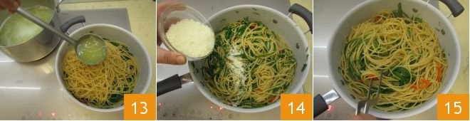 et poursuivez la cuisson en ajoutant de l'eau si nécessaire 13. Une fois prêts, éteignez le feu et assaisonnez avec le Parmesan râpé 14, en mélangeant bien le tout 15.