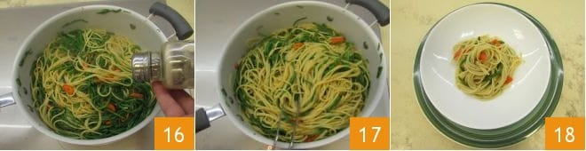 Ensuite, saupoudrez de poivre noir 16, donnez un dernier coup de cuillère 17 et vos spaghetti aux asperges de mer sont prêts à être servis 18 !