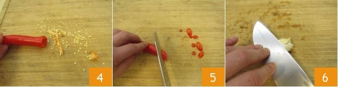 Ensuite, tapez le piment sur la planche à découper pour faire sortir toutes les graines 4. Coupez-le en rondelles d'environ un demi-centimètre et mettez de côté 5. Puis écrasez légèrement la gousse d'ail avec un couteau 6 pour la peler plus facilement.