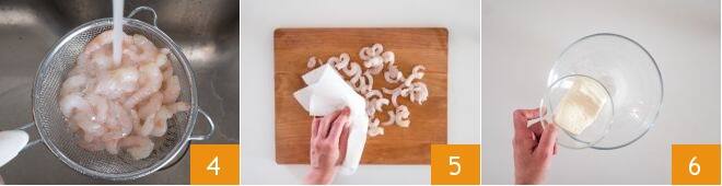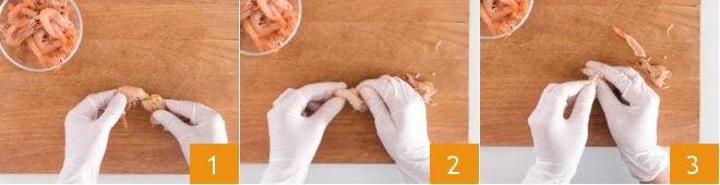 Pour préparer les spaghetti aux crevettes, stracchino et safran, commencez par nettoyer les crevettes. Portez des gants en latex, puis exercez une légère pression pour retirer la tête 1, la queue et la carapace 2. Ensuite, utilisez un cure-dent pour enlever délicatement le filament noir 3.