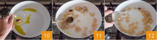 Portez à ébullition une casserole pleine d'eau, puis salez pour la cuisson des pâtes. Dans une poêle, versez un filet d'huile et l'ail juste écrasé 10; laissez-le dorer puis ajoutez également les crevettes et faites sauter le tout pendant une demi-minute à feu vif 11. Déglacez ensuite avec le vin blanc 12