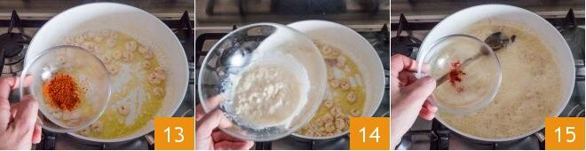 et lorsqu'il sera complètement évaporé, ajoutez du piment en poudre 13, la crème de stracchino 14 et le safran 15.