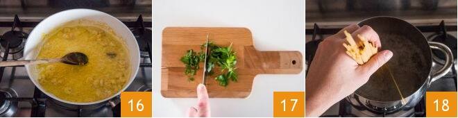 Mélangez bien et faites cuire jusqu'à ce que le fromage soit fondu 16. Pendant ce temps, hachez le persil 17 et faites cuire également les pâtes 18.