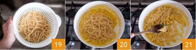 Égouttez-les al dente 19 et transférez-les dans la poêle avec la sauce 20. Enlevez la gousse d'ail 21