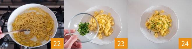 et faites sauter les pâtes avec la sauce 22. À ce stade, dressez les assiettes en décorant avec du persil 23 et servez vos spaghetti aux crevettes, stracchino et safran 24.