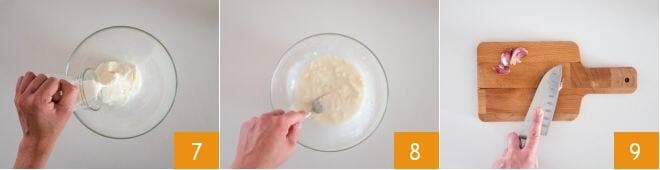 ajoutez le lait 7 et travaillez-le avec une fourchette jusqu'à obtenir une consistance crémeuse 8. Écrasez ensuite une gousse d'ail en utilisant la lame d'un couteau 9.